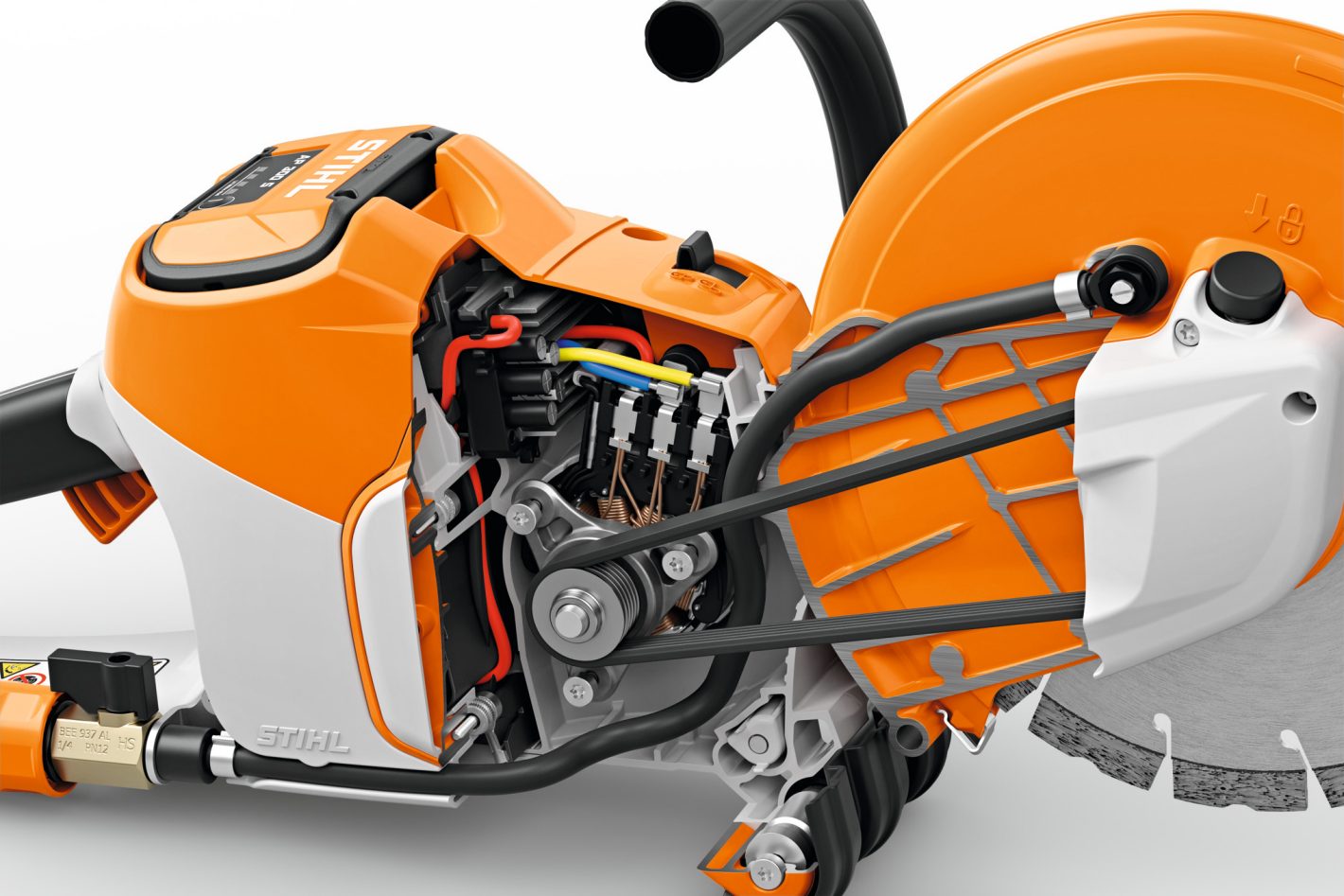 Water is supplied to the cutting wheel through the standard water connection with sprinkler system to suppress the dust produced during cutting. It is supplied to the device in such a way so as not to interfere with your work.